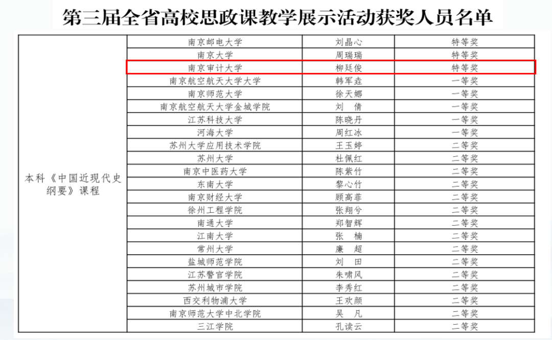 近日,江苏省教育厅公示《省教育厅办公室关于组织开展第三届全省高校思政课教学展示活动的通知》(苏教办社政函〔2024〕25号),马克思主义学院柳廷俊老师讲授的《提出实现中华民族伟大复兴的中国梦》荣获特等奖。
