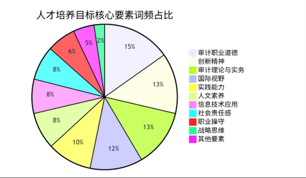 审计硕士人才培养目标围绕“职业道德、专业能力、综合素养”三大维度形成高度共识,既锚定审计行业对“专业过硬、操守端正”的基本要求,又呼应数字经济与国际审计发展的新需求,整体呈现“德才兼备、技专能强”的导向。