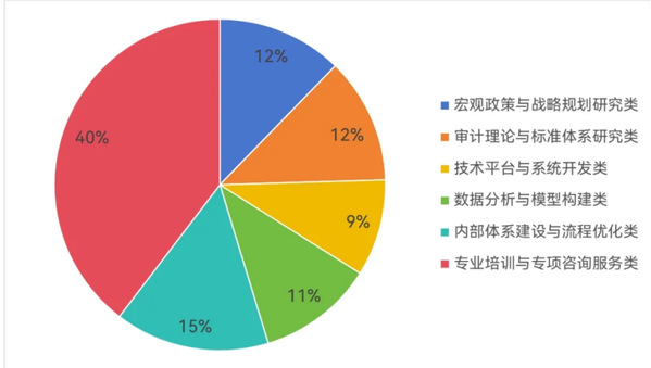 “调研采集数据”共采集到完整的横向课题信息107项,对收集到的有效信息进行分类,可将审计类横向课题按项目性质和产出导向分为六类,分别为宏观政策与战略规划研究类、审计理论与标准体系研究类、技术平台与系统开发类、数据分析与模型构建类、内部体系建设与流程优化类、专业培训与专项咨询服务类,其中专业培训与专项咨询服务类占比 40% 居首,其余五类占比 10%-15% 相对均衡,整体凸显实践服务导向。